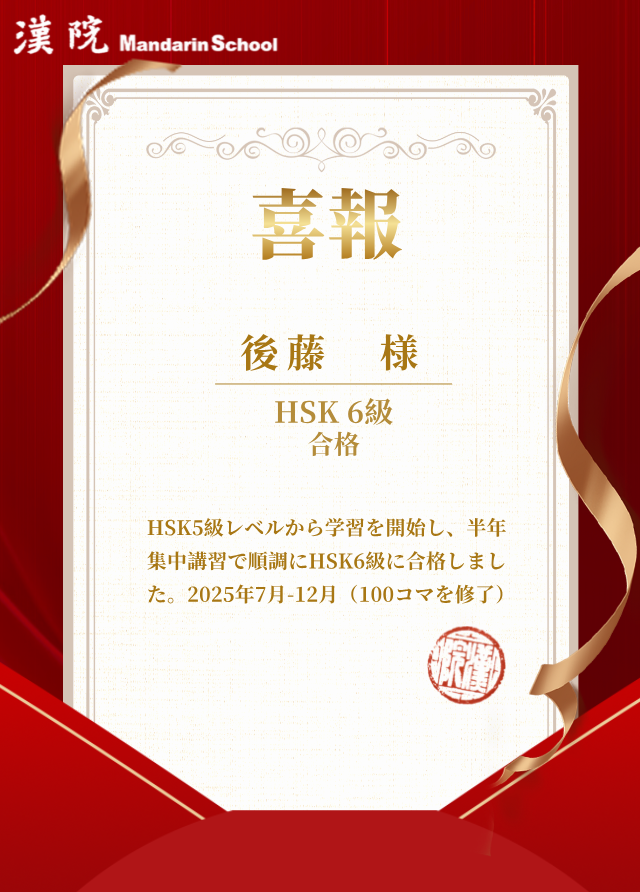 後藤様が HSK6 級に合格されました、おめでとうございます!