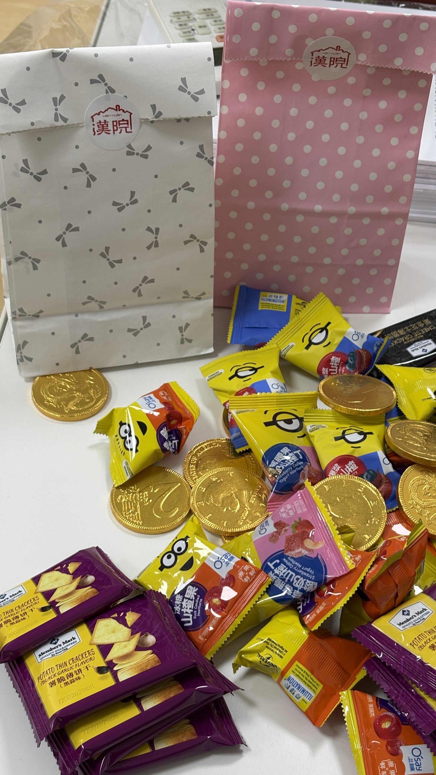 このたび、新年のご挨拶として、来校してくださる皆さまのために、小さなお菓子を準備しています。ゴールドコインチョコレート、氷砂糖サンザシ、ヨーグルトサンザシ粒、黒ゴールドチーズクラッカー、ポテトクラッカーをご用意しておりますので、ぜひお召し上がりください。