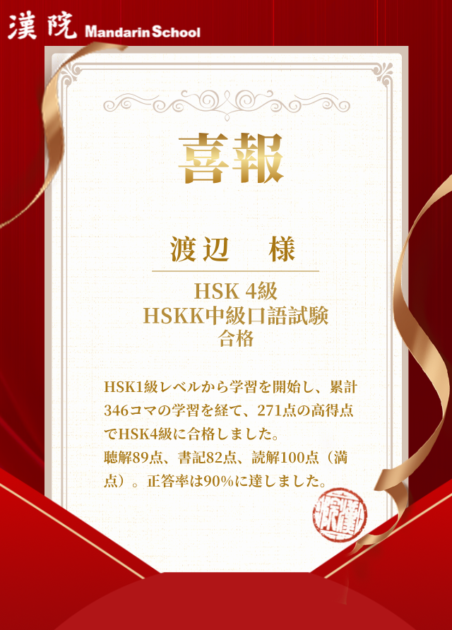 村上様が HSK6 級に合格、赤井様が HSK5 級に合格、渡辺様が HSK4 級に合格されました、おめでとうございます!