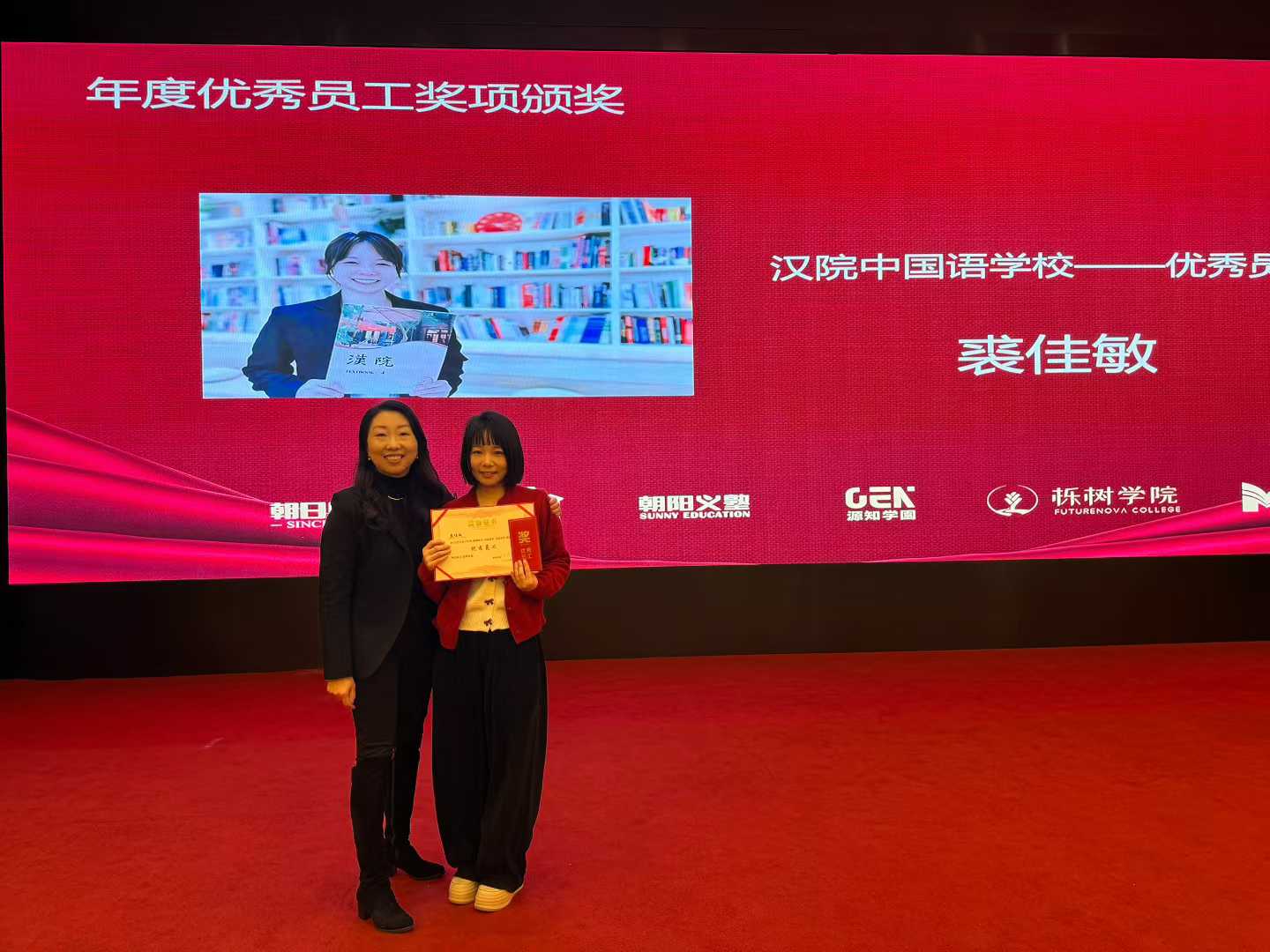 夜が訪れ、年次業務総括暨び優秀従業員表彰式が盛大に開催されました。学校経営陣が過去 1 年間の办学成果を振り返るとともに、各賞の表彰が行われ、その中で裘先生は漢院 2025 年度優秀従業員賞を栄えある受賞となりました。